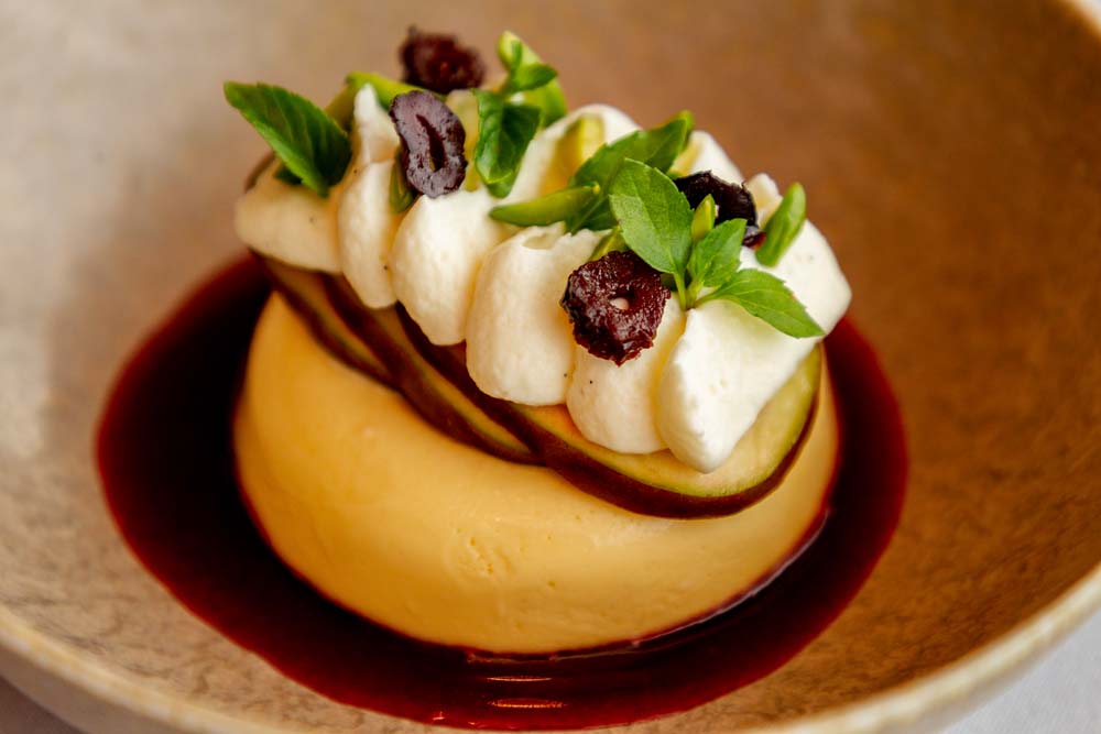 - Pipe cultured goat milk over the top and sprinkle with pistachio nuts, candied olives and a few drops of olive oil.
