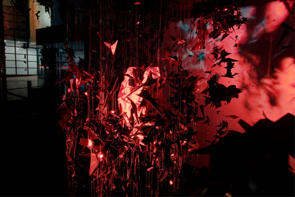 To address this concern, Nikky invited visitors into Cube 37 to experience a landscape of gunfire frozen in time. In the centre was a child-size bulletproof vest constructed from hundreds of love letters written by mothers in the local community to their children. This vest creates a force field of love while diverting a cloud of shrapnel.