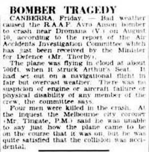 Killed were Pilot Officer Stanley Robert Symonds, aged 22 years, of Adelaide; Flight Sergeant John Mahon Gillespie, 28, of St Kilda; Aircraftsman Kenneth Campbell McKerrow, 23, of Carnegie; and Aircraftsman Robert Windram Mawson, 28, of Turramurra, NSW.