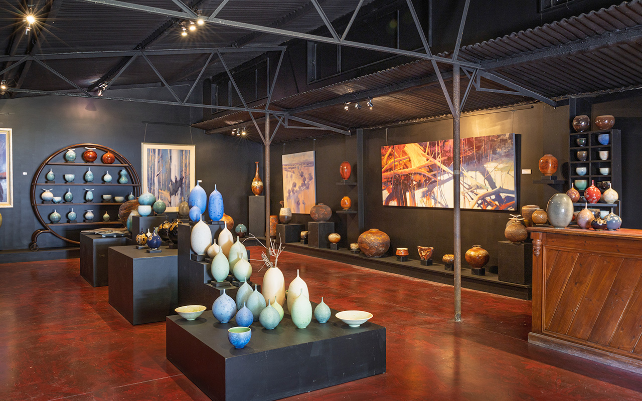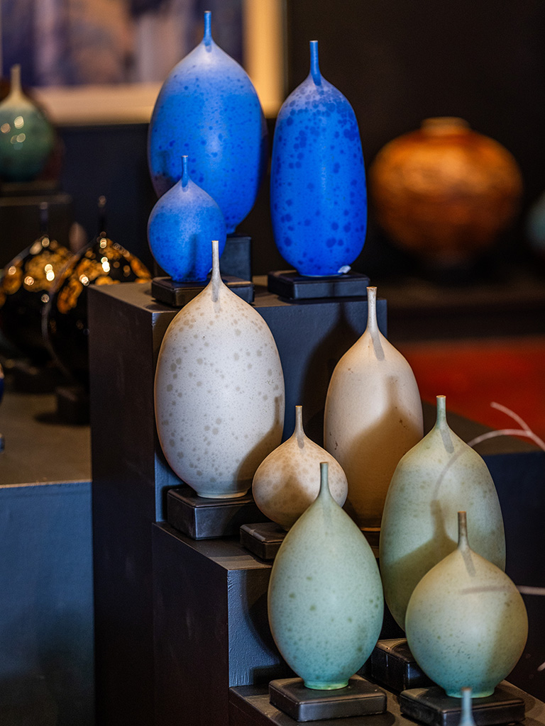 In 2014, he moved to his current studio and on-site gallery in Moorooduc, which has a rainbow of perfect pots and many more waiting to be glazed. While working at the wheel comes easily after a lifetime of experience, crystalline glazes continue to challenge and enthral him.