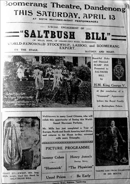 In fact the royal demonstration was to be a turning point for Mills. He realised that money could be made from wielding the stock whip for appreciative audiences and he entered show business. ‘Saltbush Bill’ became his show name.