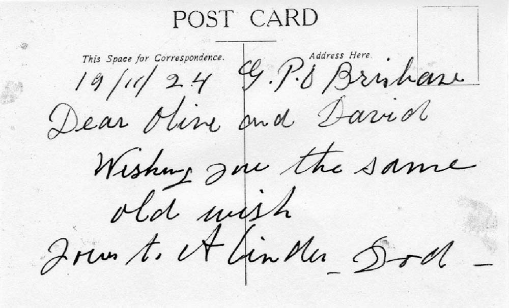 Bottom: Short message to Balnarring cousins, written on the reverse side of the Government House postcard.