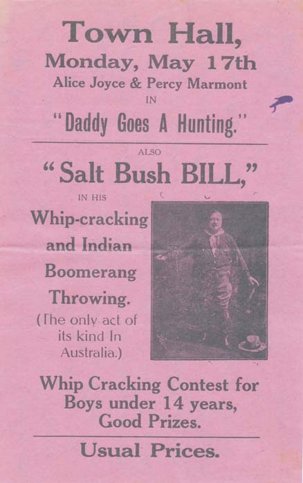In 1910 Saltbush Bill was advertising himself on his professional card as “Champion Stock Whip Cracker of Australia”.