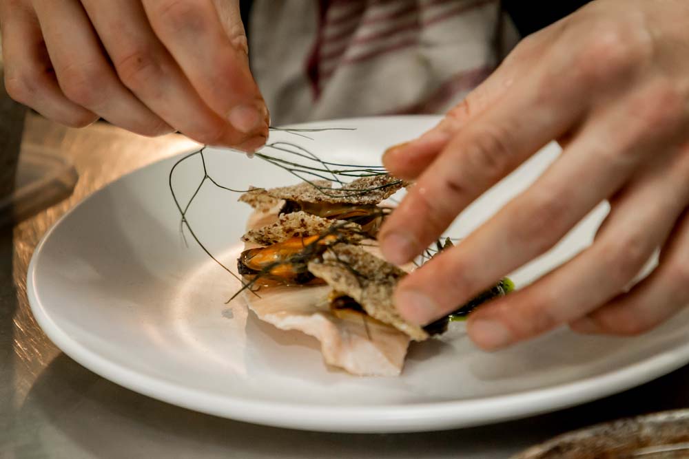 Rainbow trout with burnt lettuce sauce, mussels and quinoa chips