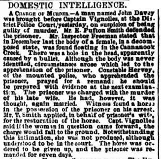 On Thursday 22 March, 1855 The Argus reported that John Davey had appeared in the District Police Court “…charged with the murder of his late wife.” The account that follows is rather confusing: first we are informed that Davey had “again married”, then that the prisoner’s wife had applied for possession of the horse that was in his possession when arrested. At this point the officer conducting the case (Captain Vignolles) said that “…if the woman in question came forward the charge would fall to the ground.” The report then states: “Notwithstanding this intimation, she was not produced, although understood to be in the court.” So we are left to guess: Which wife was supposedly in court and why was she reluctant to come forward?